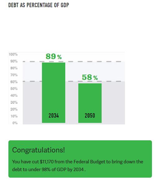 The nonpartisan Committee for a Responsible Federal Budget has a great tool that allows you to try to stabilize our national debt. It gives options for changing government income and spending, with a goal of getting the debt to GDP ratio under 90% by 2034 and under 60% by 2050. Try it out and post your results or ideas in a comment!