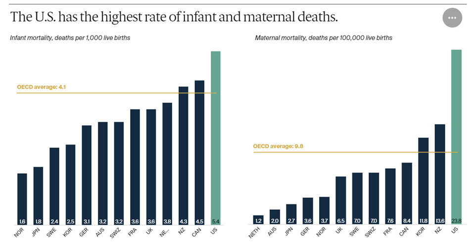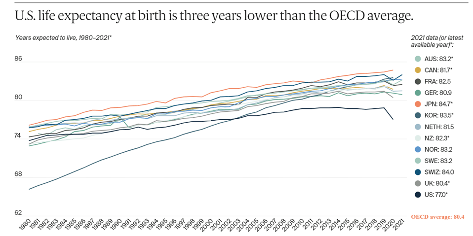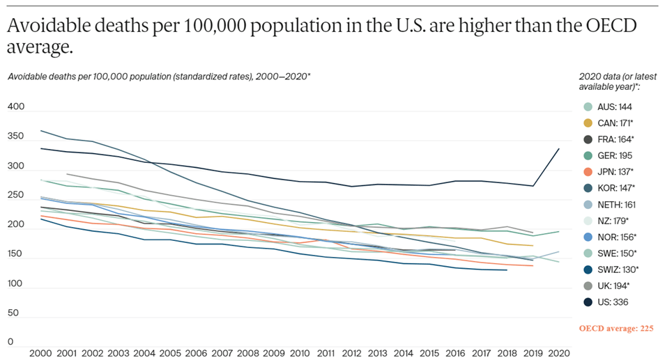 Since we spend so much more, you would expect that we get significantly better results. If you look at life expectancy, avoidable deaths, infant mortality, and maternal mortality, our results are the worst of these major developed democracies by far…and we are falling further behind over time. Of all these countries, we are the only one that doesn’t cover everybody…we still have 26 million people (7.7% of our population) without healthcare coverage in 2024.