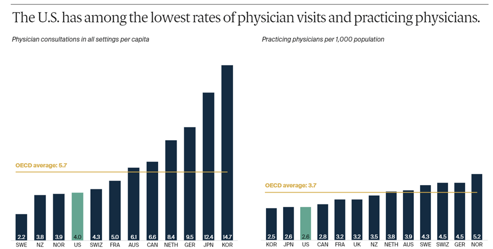 Is our extra expense buying us more access to physicians and visits with our doctors? No. We are near the bottom of this group in physician consults and practicing physicians per capita.