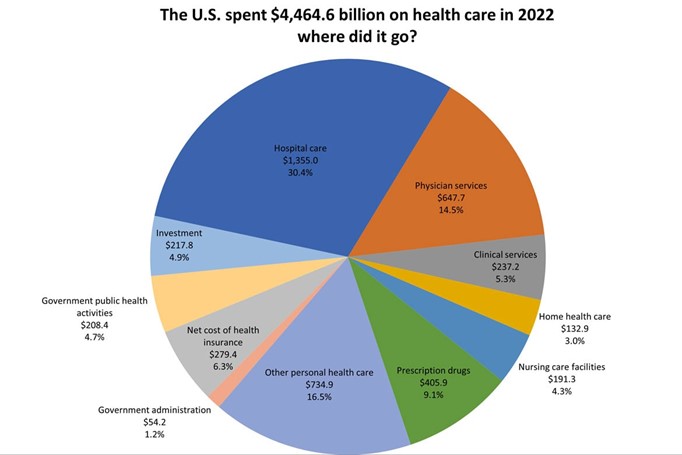 Since we are paying so much more than other countries and getting relatively poor outcomes, there must be a big opportunity for improvement. If we can understand where the money is going, maybe we can find opportunities to reduce the cost. Medicare and Medicaid are the number 2 and 3 line items in our federal budget, so if we can bring our costs down while maintaining or improving health outcomes, it could be a major enabler for balancing our budget. Breakdowns of spending to their major categories are readily available, like this one from 2022.
